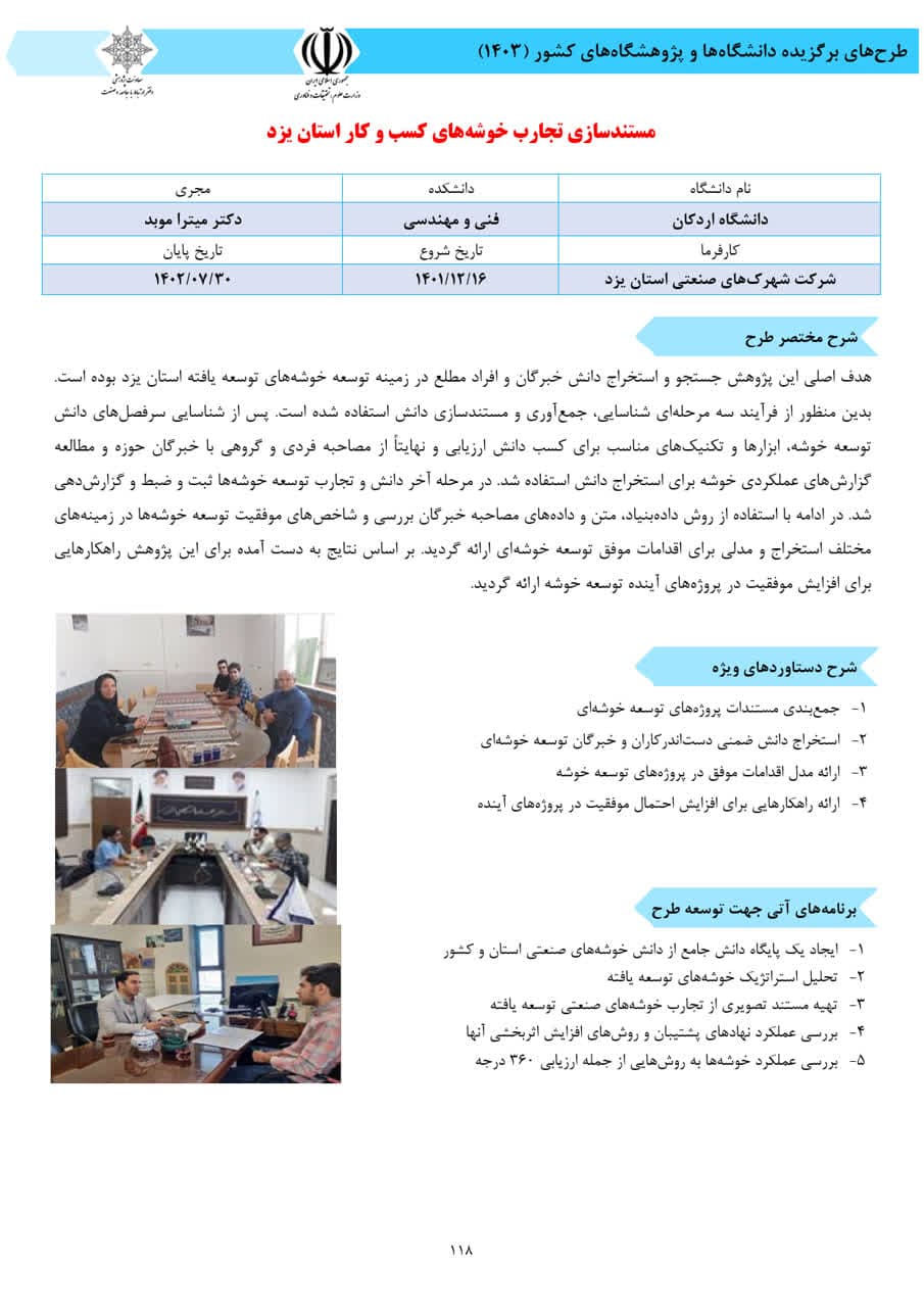 In this collection, two projects by Dr. Mitra Mobad titled “Feasibility Study on the Implementation of Digital Maturity Assessment Models in Mining and Steel Companies” and “Documentation of the Experiences of Business Clusters in Yazd Province,” as well as a joint project by Dr. Mina Alafzadeh and Dr. Mehran Rabani titled “The Effect of Insulation on Reducing Cooling Load in Buildings,” have been introduced as distinguished research projects.