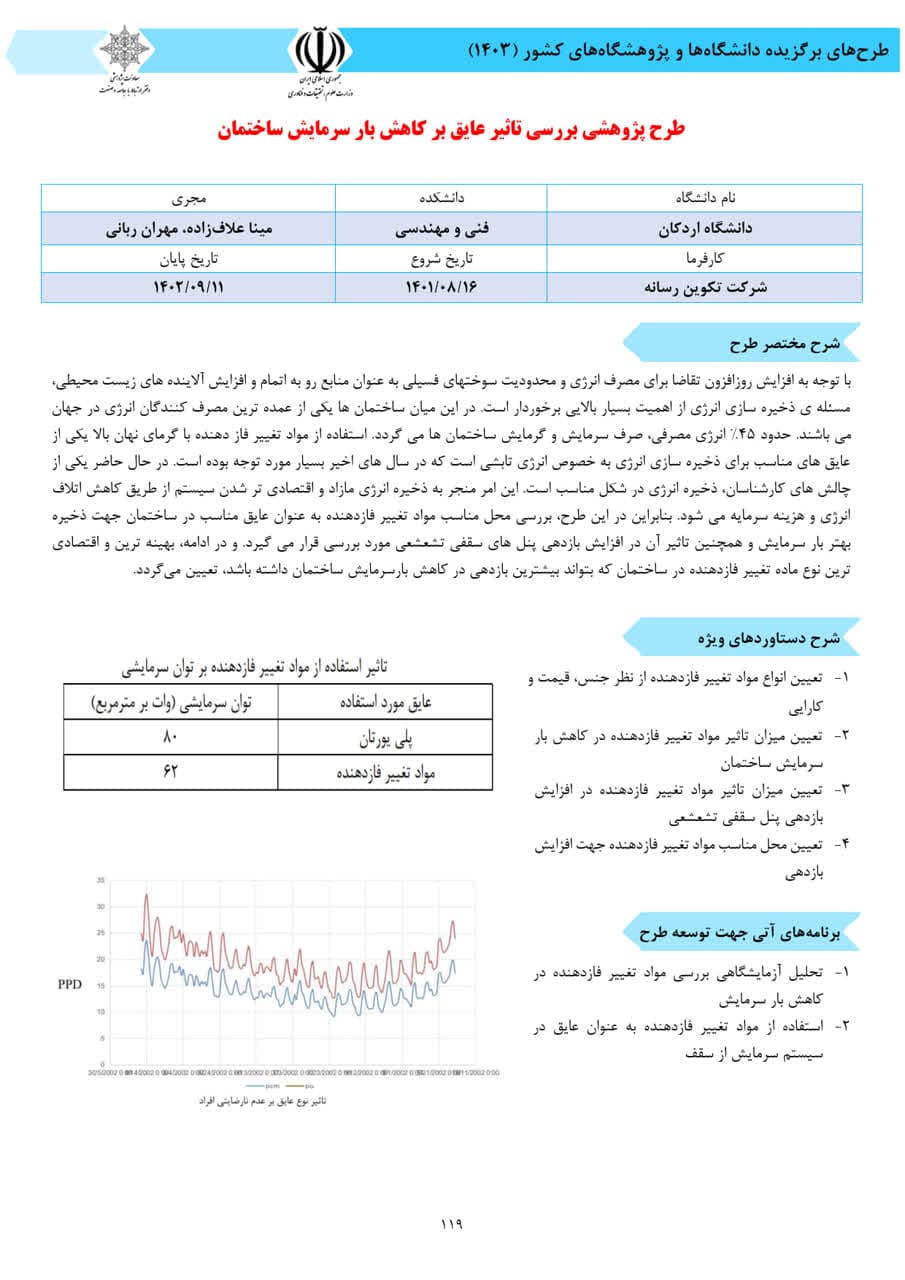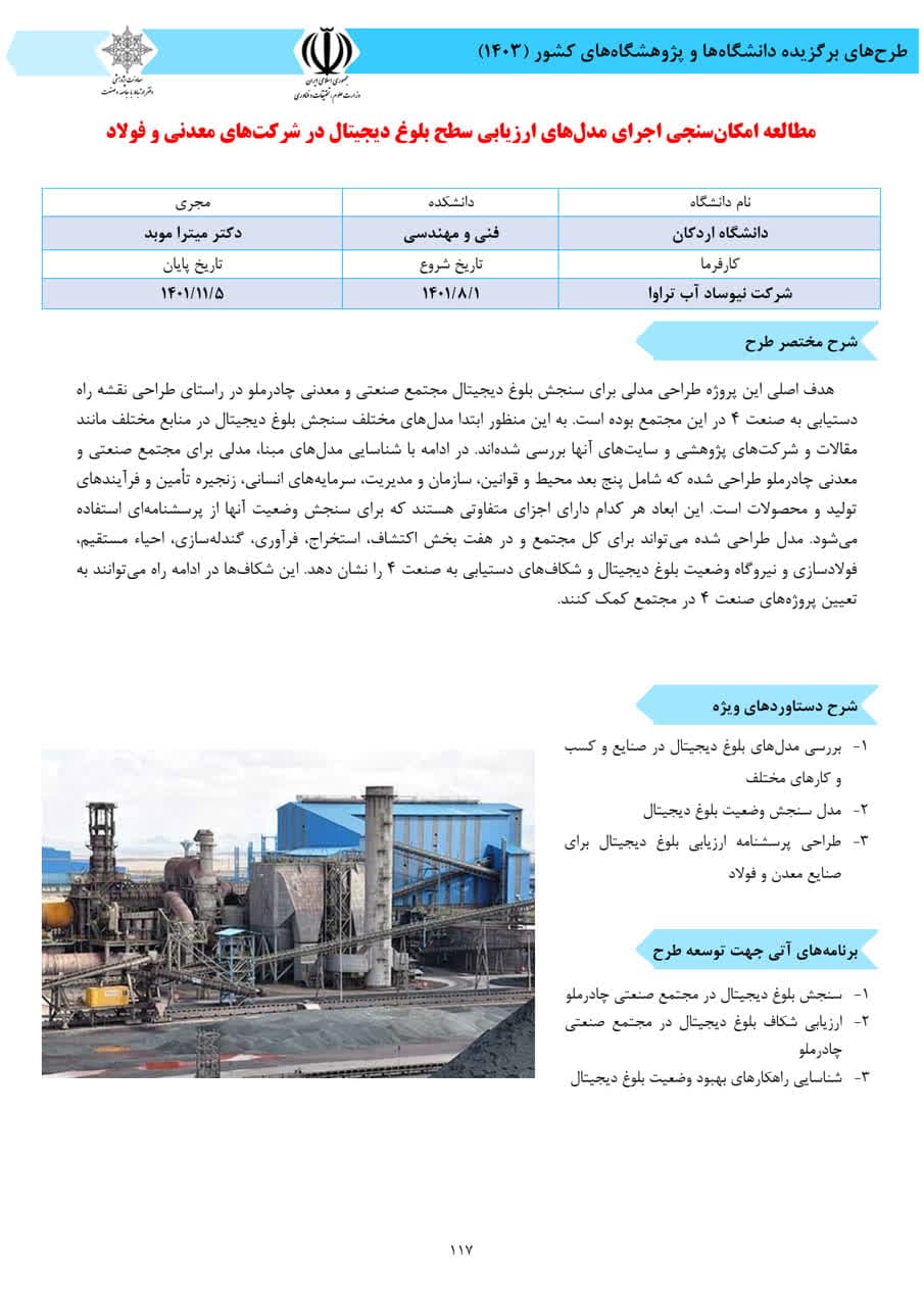 در این مجموعه؛ دو طرح خانم دکتر میترا موبد با عنوانهای «مطالعه امکانسنجی اجرای مدلهای ارزیابی سطح بلوغ دیجیتال در شرکتهای معدنی و فولاد» و «مستندسازی تجارب خوشههای کسب و کار استان یزد»، و طرح مشترک خانم دکتر مینا علافزاده و آقای دکتر مهران ربانی با عنوان «تاثیر عایق بر کاهش بار سرمایش ساختمان»، به عنوان طرحهای پژوهشی برگزیده معرفی شده است. روابط عمومی و امور بینالملل دانشگاه، ضمن قدردانی از تلاشهای موثر و سودمند سه عضو محترم دانشکده فنی و مهندسی، این افتخار را به تمام جامعه علمی دانشگاهیان و شهرستان اردکان تبریک گفته و تدوام این موفقیتها را از خداوند علیم مسئلت دارد. امید است با استقرار نظام مسائل و جهتدهی فعالیت و تحقیقات شاهد اثربخشی حوزه آموزش عالی در رفع نیازهای جامعه و صنعت باشیم.